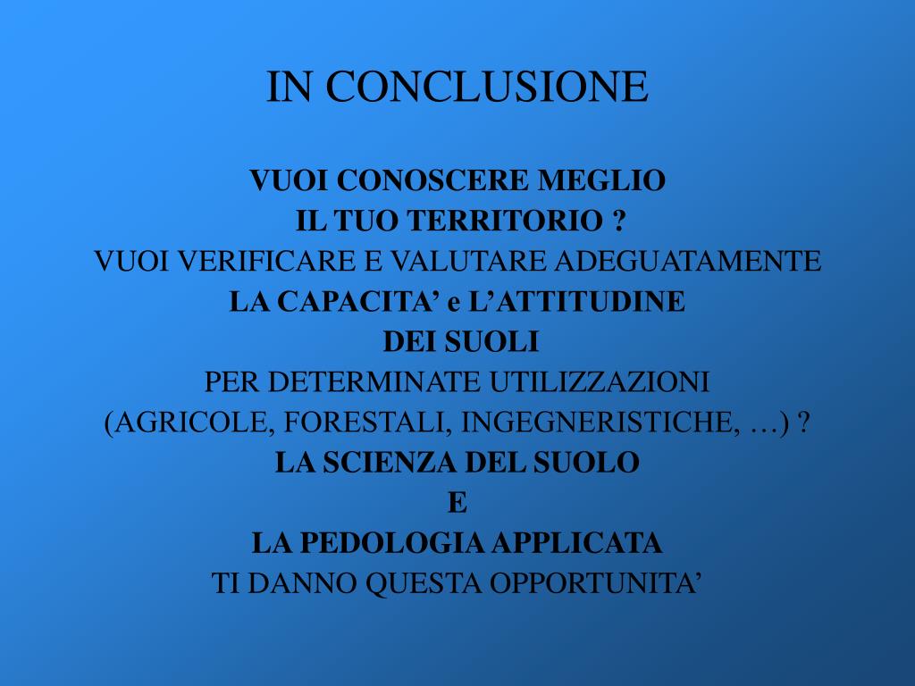 IN CONCLUSIONE VUOI CONOSCERE MEGLIO IL TUO TERRITORIO ? VUOI VERIFICARE E VALUTARE ADEGUATAMENTE LA CAPACITA’ e L’ATTITUDINE DEI SUOLI PER DETERMINATE UTILIZZAZIONI (AGRICOLE, FORESTALI, INGEGNERISTICHE, …) ? LA SCIENZA DEL SUOLO E LA PEDOLOGIA APPLICATA TI DANNO QUESTA OPPORTUNITA’