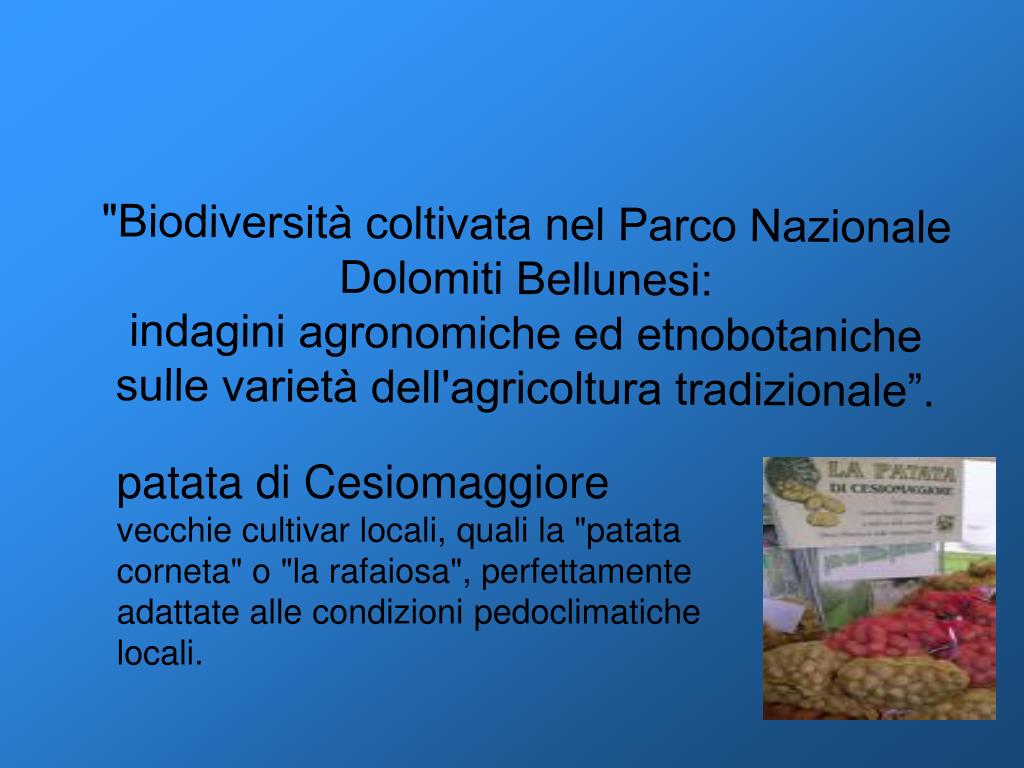 "Biodiversità coltivata nel Parco Nazionale Dolomiti Bellunesi: indagini agronomiche ed etnobotaniche sulle varietà dell'agricoltura tradizionale”. patata di Cesiomaggiore vecchie cultivar locali, quali la "patata corneta" o "la rafaiosa", perfettamente adattate alle condizioni pedoclimatiche locali.
