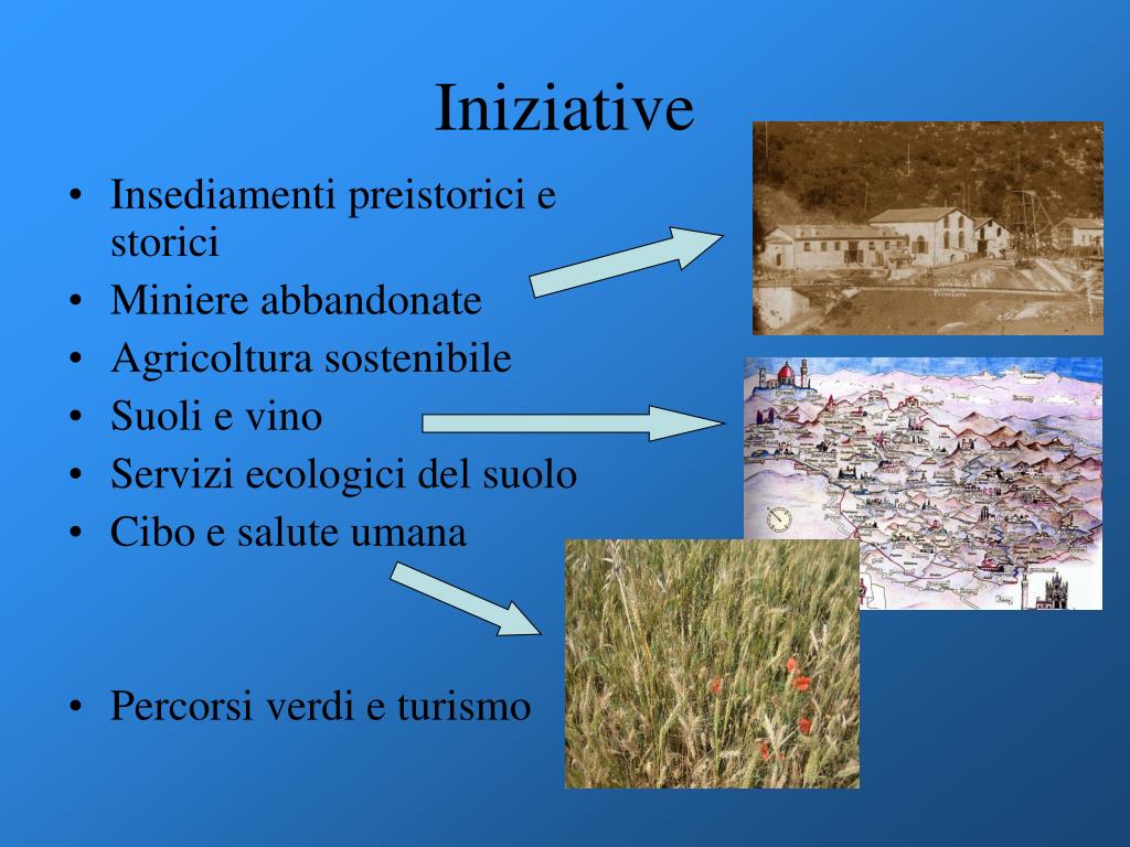 Iniziative • Insediamenti preistorici e storici • Miniere abbandonate • Agricoltura sostenibile • Suoli e vino • Servizi ecologici del suolo • Cibo e salute umana • Percorsi verdi e turismo