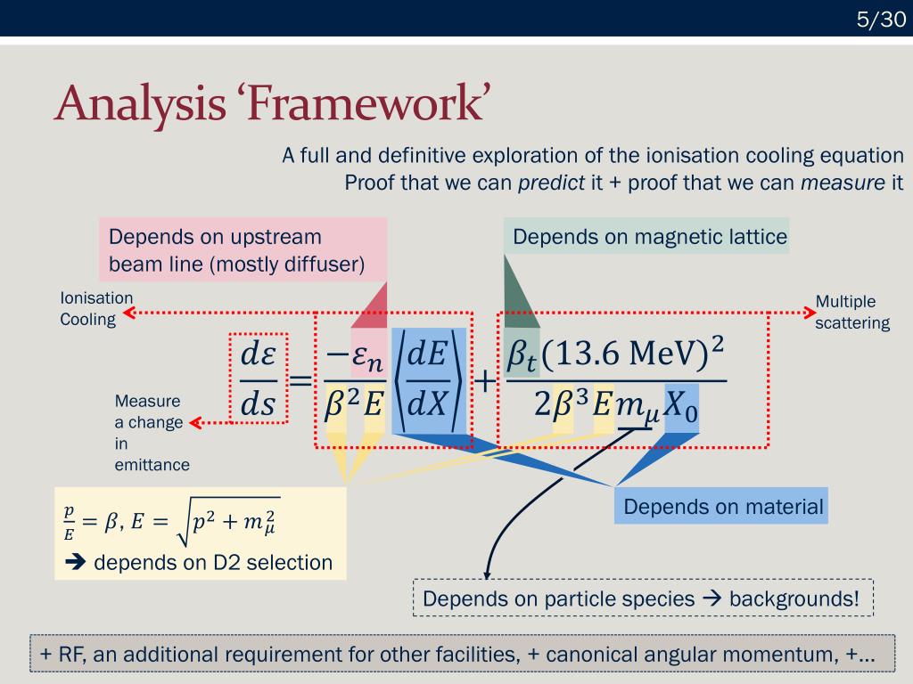 5/30 Analysis ‘Framework’ A full and definitive exploration of the ionisation cooling equation Proof that we can predict it + proof that we can measure it Depends on upstream beam line (mostly diffuser) Depends on magnetic lattice Ionisation Cooling Multiple scattering Measure a change in emittance , depends on D2 selection Depends on material Depends on particle species backgrounds! + RF, an additional requirement for other facilities, + canonical angular momentum, +...