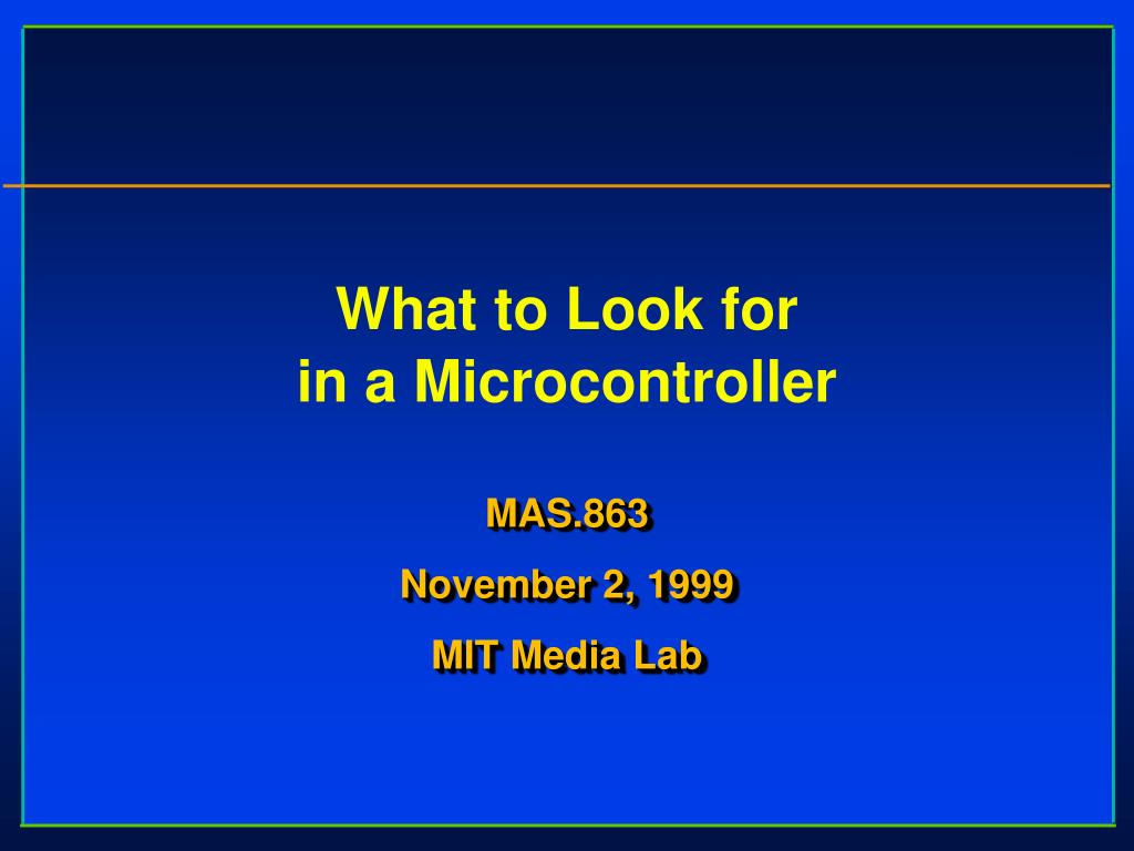 What to Look for in a Microcontroller. MAS.863 November 2, 1999 MIT Media Lab. What is a Microcontroller? . Small, lightweight CPU Some Families: PIC SH1 ADuC812 68HC11. What you get. Simple hardware to software interface In situ processing (on a PCB, shoe, etc) Less ICs.