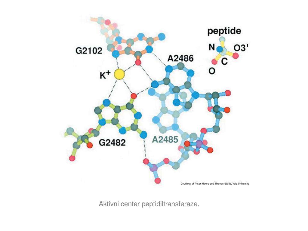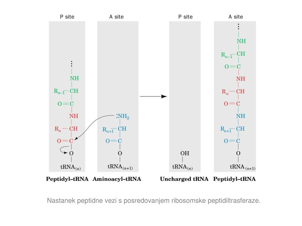 Nastanek peptidne vezi s posredovanjem ribosomskepeptidiltrasferaze.