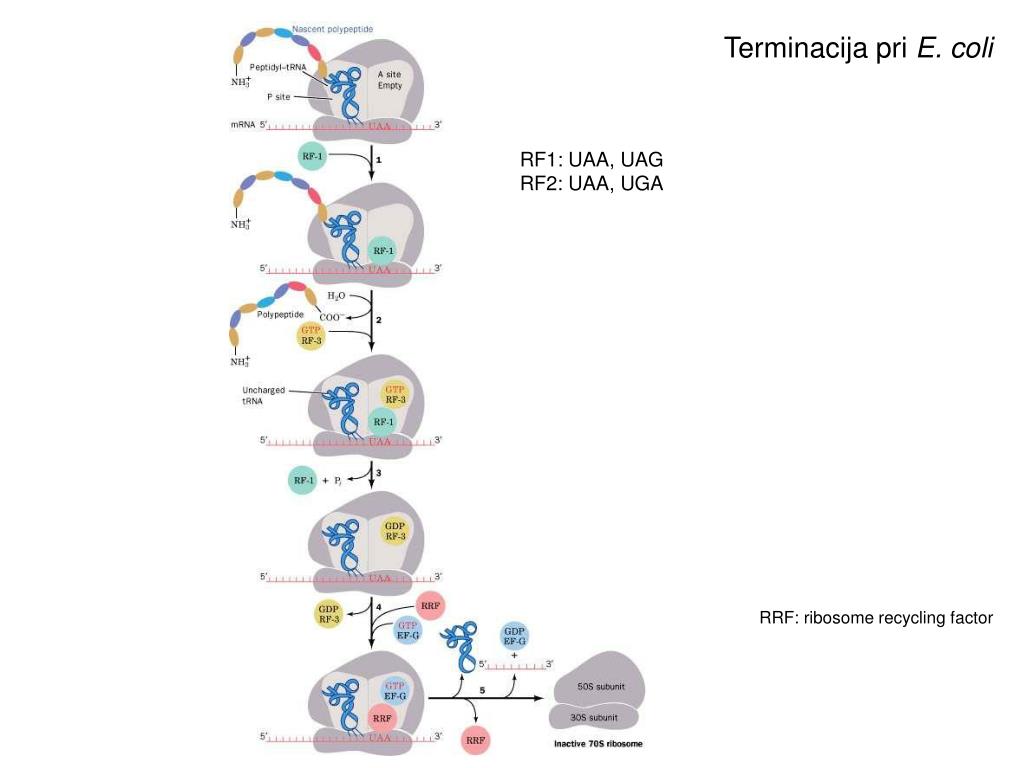 Terminacija pri E. coli RF1: UAA, UAG RF2: UAA, UGA RRF: ribosome recycling factor