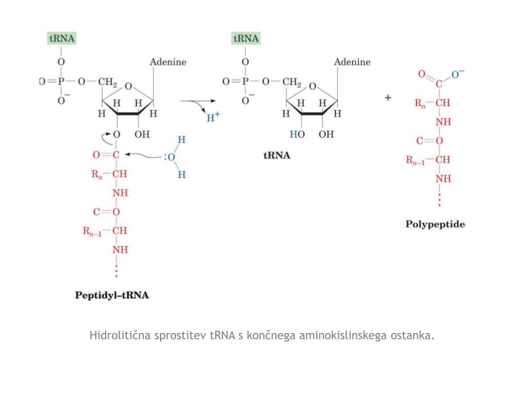 Hidrolitična sprostitev tRNA s končnega aminokislinskega ostanka.
