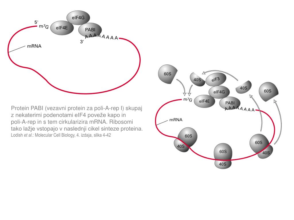 Protein PABI (vezavni protein za poli-A-rep I) skupaj z nekaterimi podenotami eIF4 poveže kapo inpoli-A-rep in s tem cirkularizira mRNA. Ribosomi tako lažje vstopajo v naslednji cikel sinteze proteina. Lodish et al.: Molecular Cell Biology, 4. izdaja, slika 4-42
