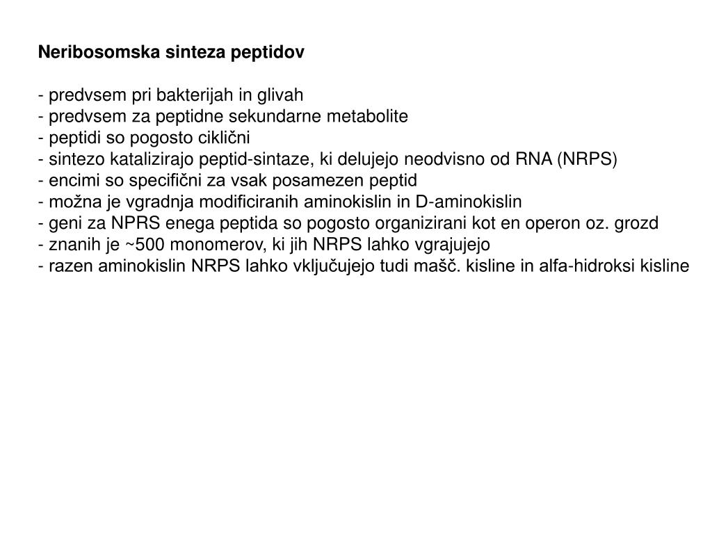 Neribosomska sinteza peptidov - predvsem pri bakterijah in glivah - predvsem za peptidne sekundarne metabolite - peptidi so pogosto ciklični - sintezo katalizirajo peptid-sintaze, ki delujejo neodvisno od RNA (NRPS) - encimi so specifični za vsak posamezen peptid - možna je vgradnja modificiranih aminokislin in D-aminokislin - geni za NPRS enega peptida so pogosto organizirani kot en operon oz. grozd - znanih je ~500 monomerov, ki jih NRPS lahko vgrajujejo - razen aminokislin NRPS lahko vključujejo tudi mašč. kisline in alfa-hidroksi kisline
