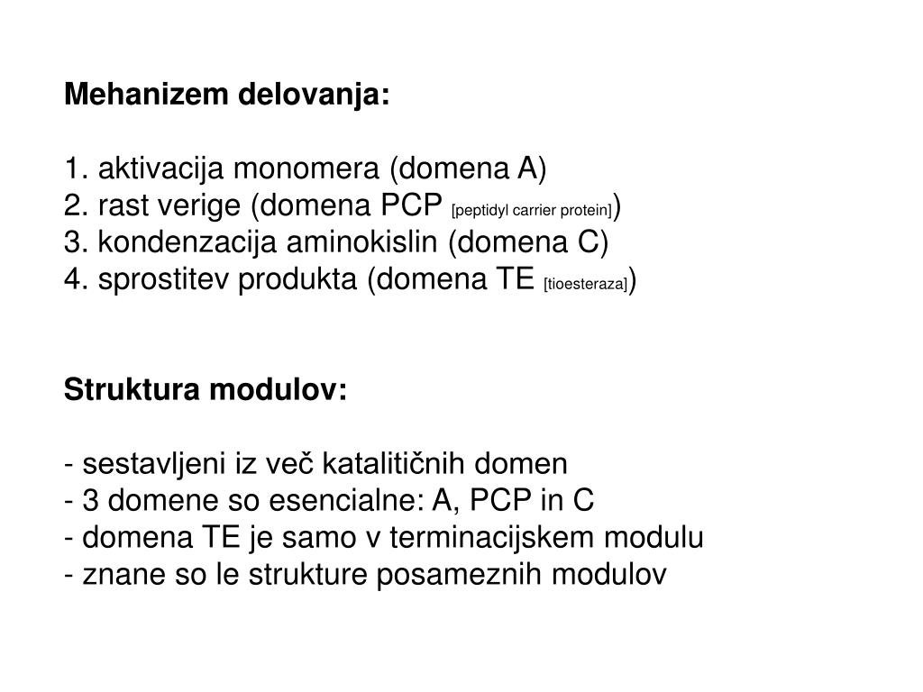 Mehanizem delovanja: 1. aktivacija monomera (domena A) 2. rast verige (domena PCP [peptidyl carrier protein]) 3. kondenzacija aminokislin (domena C) 4. sprostitev produkta (domena TE [tioesteraza]) Struktura modulov: - sestavljeni iz več katalitičnih domen - 3 domene so esencialne: A, PCP in C - domena TE je samo v terminacijskem modulu - znane so le strukture posameznih modulov
