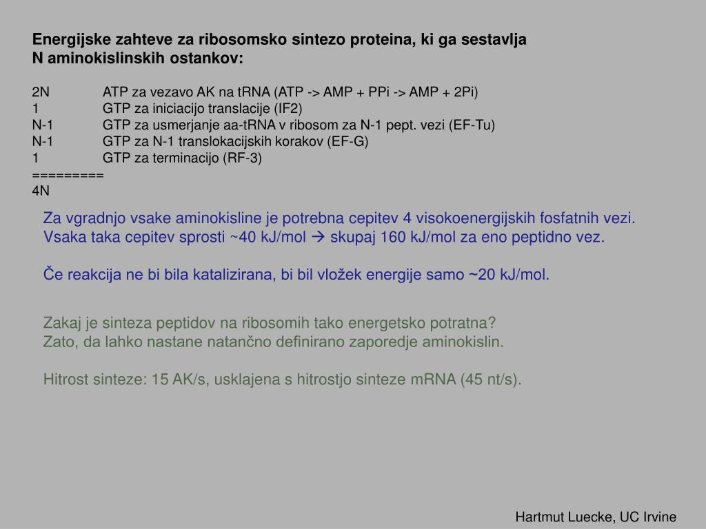 Energijske zahteve za ribosomsko sintezo proteina, ki ga sestavlja N aminokislinskih ostankov: 2N ATP za vezavo AK na tRNA (ATP -> AMP + PPi -> AMP + 2Pi) 1 GTP za iniciacijo translacije (IF2) N-1 GTP za usmerjanje aa-tRNA v ribosom za N-1 pept. vezi (EF-Tu) N-1 GTP za N-1 translokacijskih korakov (EF-G) 1 GTP za terminacijo (RF-3) ========= 4N Za vgradnjo vsake aminokisline je potrebna cepitev 4 visokoenergijskih fosfatnih vezi. Vsaka taka cepitev sprosti ~40 kJ/mol skupaj 160 kJ/mol za eno peptidno vez. Če reakcija ne bi bila katalizirana, bi bil vložek energije samo ~20 kJ/mol. Zakaj je sinteza peptidov na ribosomih tako energetsko potratna? Zato, da lahko nastane natančno definirano zaporedje aminokislin. Hitrost sinteze: 15 AK/s, usklajena s hitrostjo sinteze mRNA (45 nt/s). HartmutLuecke, UC Irvine