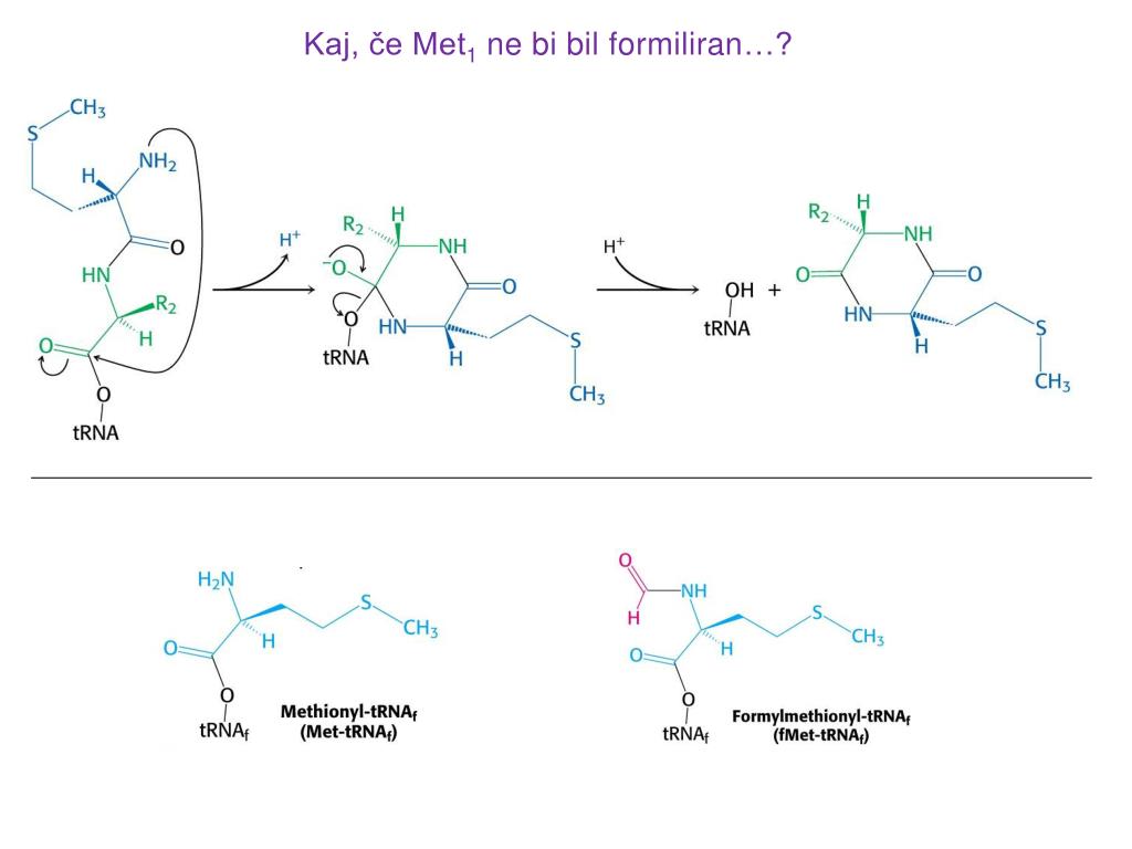 Biosinteza proteinov - nadaljevanje -. Voet 3: poglavje 32 Stryer 5: poglavje 29 Krebs 3: poglavje 24. Topni proteinski faktorji pri sintezi proteinov E. coli. Kaj, če Met 1 ne bi bil formiliran …?. Aktivni center peptidiltransferaze.