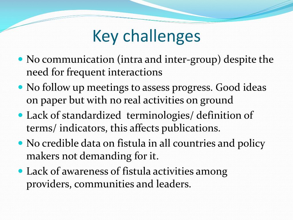 Key challenges • No communication (intra and inter-group) despite the need for frequent interactions • No follow up meetings to assess progress. Good ideas on paper but with no real activities on ground • Lack of standardized terminologies/ definition of terms/ indicators, this affects publications. • No credible data on fistula in all countries and policy makers not demanding for it. • Lack of awareness of fistula activities among providers, communities and leaders.