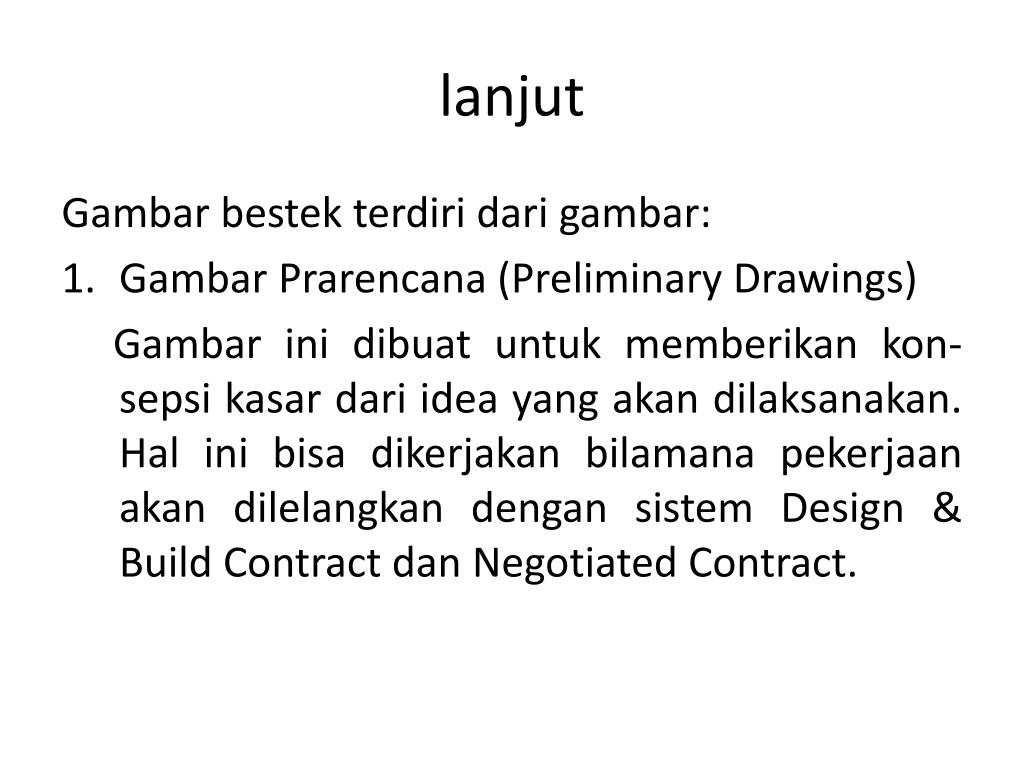 lanjut Gambarbestekterdiridarigambar: • GambarPrarencana (Preliminary Drawings) Gambarinidibuatuntukmemberikankon-sepsikasardari idea yang akandilaksanakan. Hal inibisadikerjakanbilamanapekerjaanakandilelangkandengansistem Design & Build Contract dan Negotiated Contract.