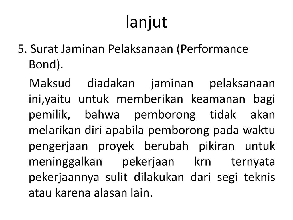 lanjut 5. Surat Jaminan Pelaksanaan (Performance Bond). Maksud diadakan jaminan pelaksanaan ini,yaitu untuk memberikan keamanan bagi pemilik, bahwa pemborong tidak akan melarikan diri apabila pemborong pada waktu pengerjaan proyek berubah pikiran untuk meninggalkan pekerjaan krn ternyata pekerjaannya sulit dilakukan dari segi teknis atau karena alasan lain.