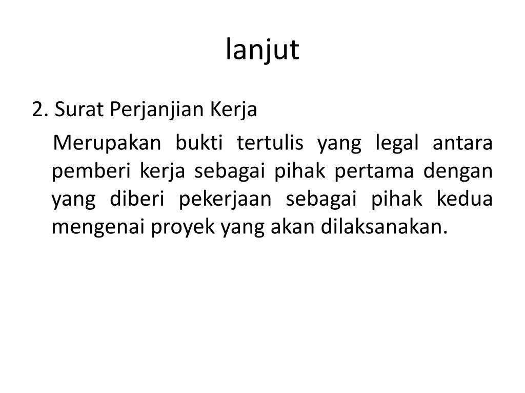 lanjut 2. Surat Perjanjian Kerja Merupakan bukti tertulis yang legal antara pemberi kerja sebagai pihak pertama dengan yang diberi pekerjaan sebagai pihak kedua mengenai proyek yang akan dilaksanakan.