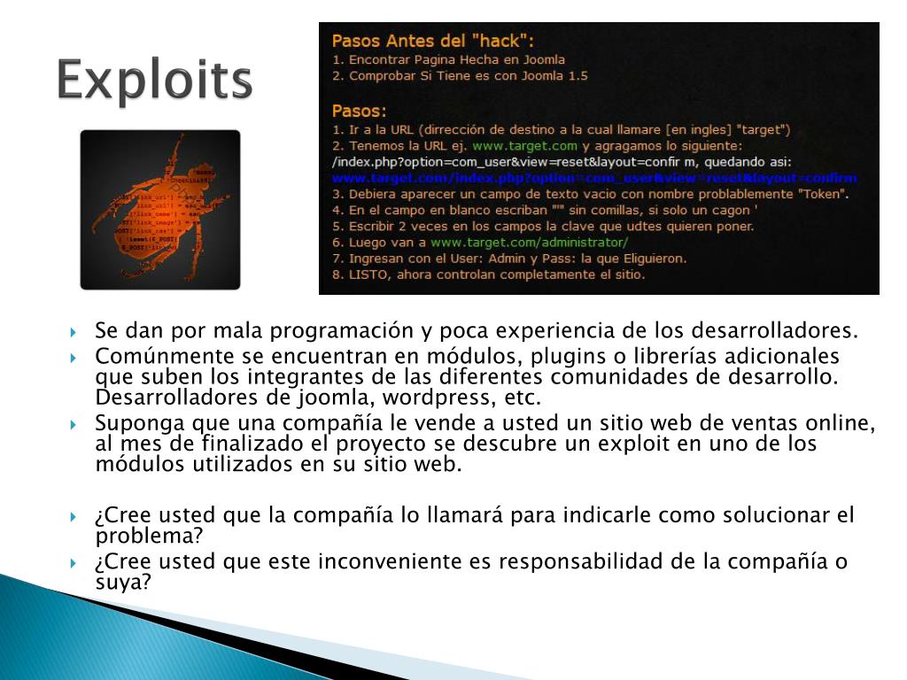 Exploits • Se dan por mala programación y poca experiencia de los desarrolladores. • Comúnmente se encuentran en módulos, plugins o librerías adicionales que suben los integrantes de las diferentes comunidades de desarrollo. Desarrolladores de joomla, wordpress, etc. • Suponga que una compañía le vende a usted un sitio web de ventas online, al mes de finalizado el proyecto se descubre un exploit en uno de los módulos utilizados en su sitio web. • ¿Cree usted que la compañía lo llamará para indicarle como solucionar el problema? • ¿Cree usted que este inconveniente es responsabilidad de la compañía o suya?