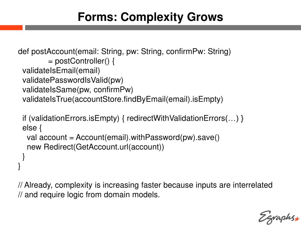 Forms: Complexity Grows defpostAccount(email: String, pw: String, confirmPw: String) = postController() { validateIsEmail(email) validatePasswordIsValid(pw) validateIsSame(pw, confirmPw) validateIsTrue(accountStore.findByEmail(email).isEmpty) if (validationErrors.isEmpty) { redirectWithValidationErrors(…) } else { val account = Account(email).withPassword(pw).save() new Redirect(GetAccount.url(account)) } } // Already, complexity is increasing faster because inputs are interrelated // and require logic from domain models.
