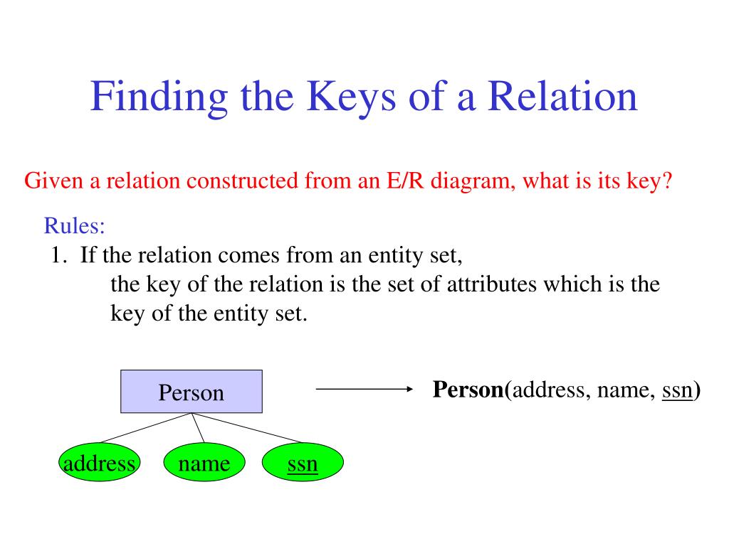Finding the Keys of a Relation Given a relation constructed from an E/R diagram, what is its key? Rules: 1. If the relation comes from an entity set, the key of the relation is the set of attributes which is the key of the entity set. Person Person(address, name, ssn) address name ssn