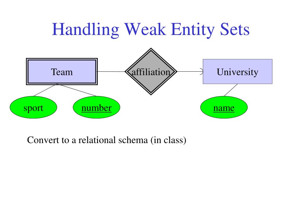 Weak Entity Sets Entity sets are weak when their key comes from other classes to which they are related. affiliation Team University sport number name