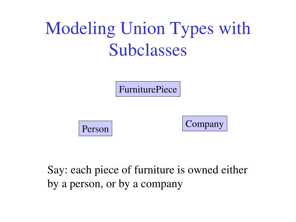 FurniturePiece Company Person Modeling Union Types with Subclasses Say: each piece of furniture is owned either by a person, or by a company