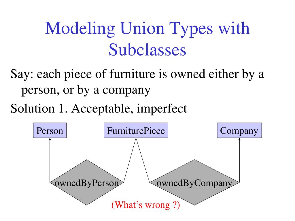 Modeling Union Types with Subclasses Say: each piece of furniture is owned either by a person, or by a company Solution 1. Acceptable, imperfect Person FurniturePiece Company ownedByPerson ownedByCompany (What’s wrong ?)