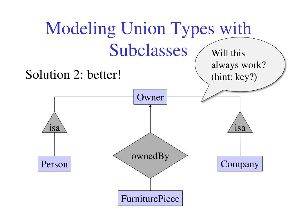 Modeling Union Types with Subclasses Will this always work? (hint: key?) Solution 2: better! Company Owner isa isa ownedBy Person FurniturePiece