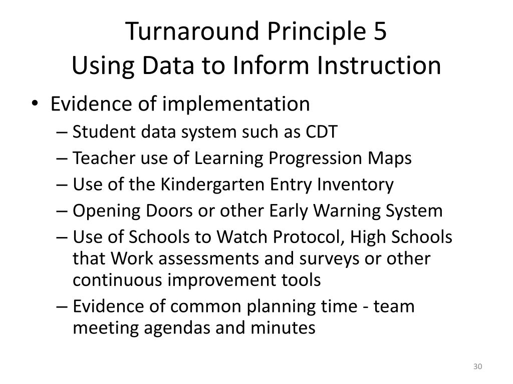 Turnaround Principle 5 Using Data to Inform Instruction • Use of a data system such as CDT to provide diagnostic information • Provide time for collaboration on the use of data • Use of an Early Warning System to improve graduation rates • Use of a reporting tool such as Kindergarten Entry Inventory to help teachers understand and track kindergarten students’ proficiency