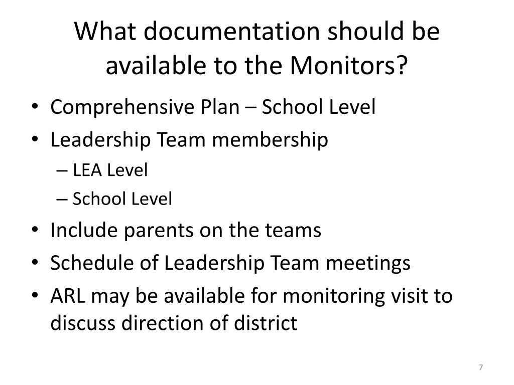What documentation should be available to the Monitors? • Comprehensive Plan – School Level • Leadership Team membership • LEA Level • School Level • Include parents on the teams • Schedule of Leadership Team meetings • ARL may be available for monitoring visit to discuss direction of district