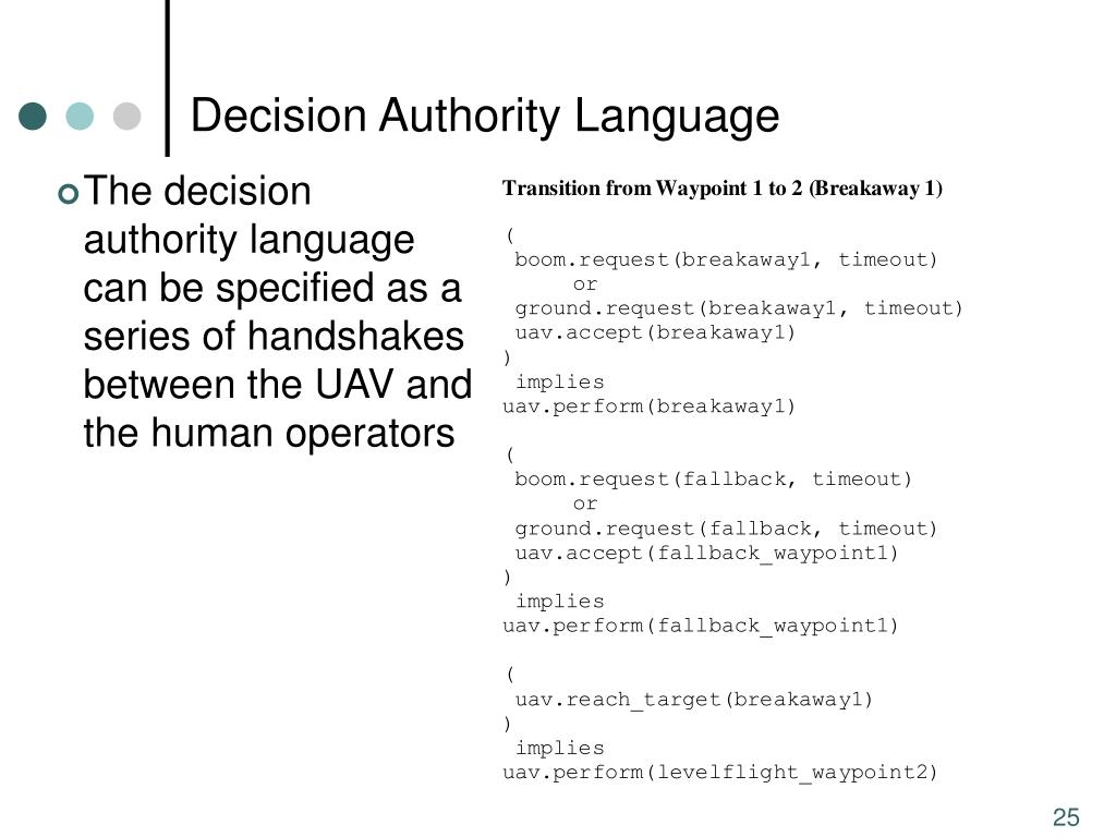 Decision Authority Language The decision authority language can be specified as a series of handshakes between the UAV and the human operators