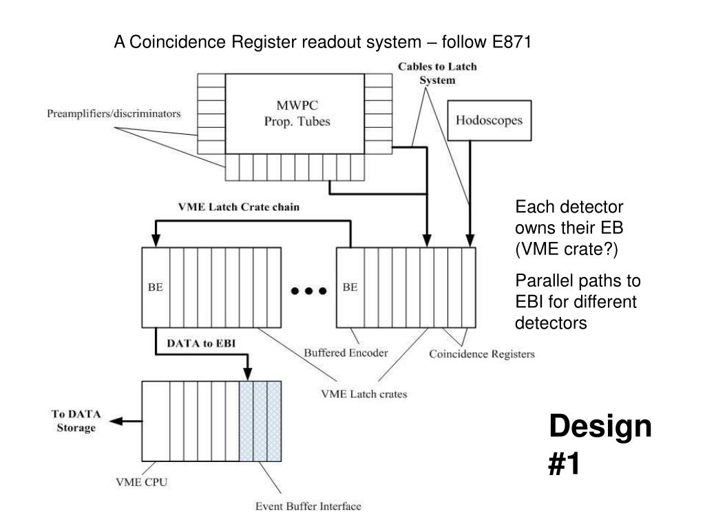 A Coincidence Register readout system – follow E871 Each detector owns their EB (VME crate?) Parallel paths to EBI for different detectors Design #1