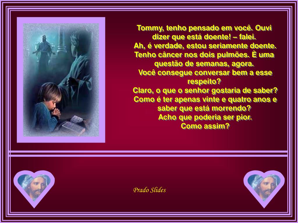 Tommy, tenho pensado em você. Ouvi dizer que está doente! – falei. Ah, é verdade, estou seriamente doente. Tenho câncer nos dois pulmões. È uma questão de semanas, agora. Você consegue conversar bem a esse respeito? Claro, o que o senhor gostaria de saber? Como é ter apenas vinte e quatro anos e saber que está morrendo? Acho que poderia ser pior. Como assim?