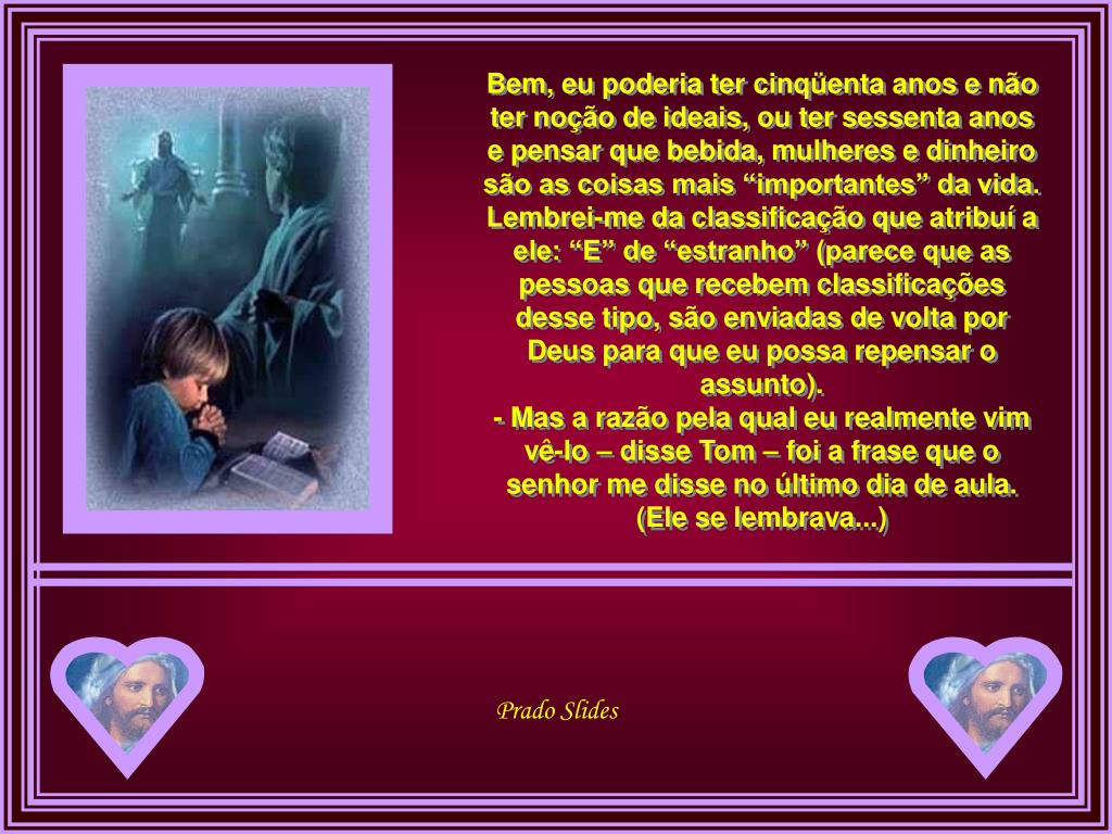 Bem, eu poderia ter cinqüenta anos e não ter noção de ideais, ou ter sessenta anos e pensar que bebida, mulheres e dinheiro são as coisas mais “importantes” da vida.Lembrei-me da classificação que atribuí a ele: “E” de “estranho” (parece que as pessoas que recebem classificações desse tipo, são enviadas de volta por Deus para que eu possa repensar o assunto).- Mas a razão pela qual eu realmente vim vê-lo – disse Tom – foi a frase que o senhor me disse no último dia de aula. (Ele se lembrava...)