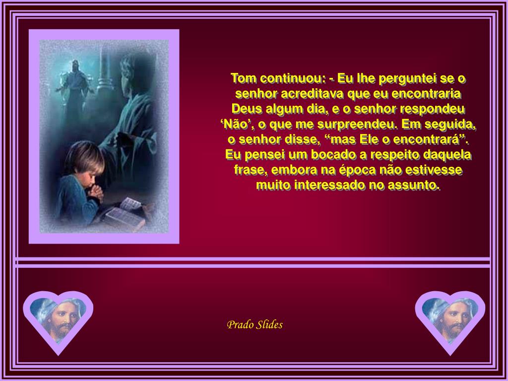 Tom continuou: - Eu lhe perguntei se o senhor acreditava que eu encontraria Deus algum dia, e o senhor respondeu ‘Não’, o que me surpreendeu. Em seguida, o senhor disse, “mas Ele o encontrará”. Eu pensei um bocado a respeito daquela frase, embora na época não estivesse muito interessado no assunto.