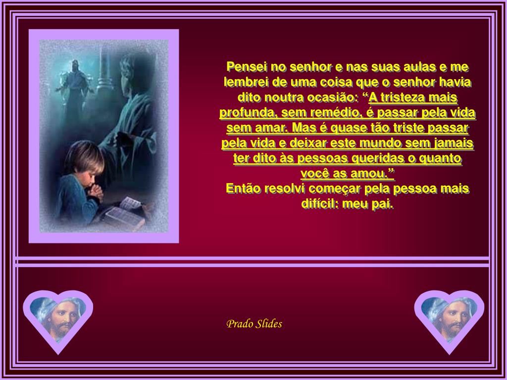 Pensei no senhor e nas suas aulas e me lembrei de uma coisa que o senhor havia dito noutra ocasião: “A tristeza mais profunda, sem remédio, é passar pela vida sem amar. Mas é quase tão triste passar pela vida e deixar este mundo sem jamais ter dito às pessoas queridas o quanto você as amou.”Então resolvi começar pela pessoa mais difícil: meu pai.