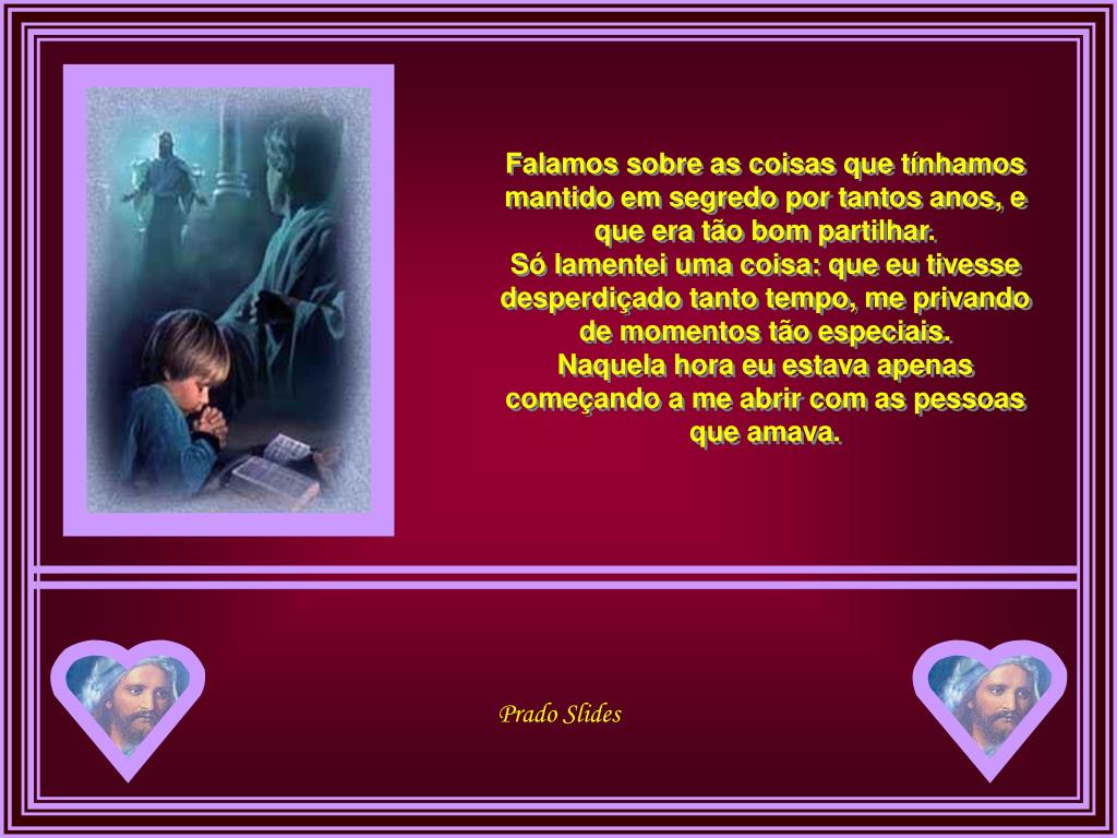 Falamos sobre as coisas que tínhamos mantido em segredo por tantos anos, e que era tão bom partilhar.Só lamentei uma coisa: que eu tivesse desperdiçado tanto tempo, me privando de momentos tão especiais.Naquela hora eu estava apenas começando a me abrir com as pessoas que amava.
