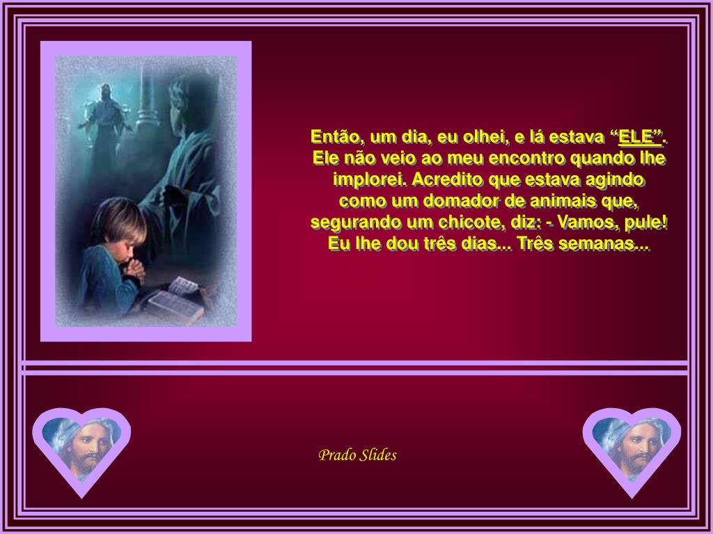 Então, um dia, eu olhei, e lá estava “ELE”. Ele não veio ao meu encontro quando lhe implorei. Acredito que estava agindo como um domador de animais que, segurando um chicote, diz: - Vamos, pule! Eu lhe dou três dias... Três semanas...