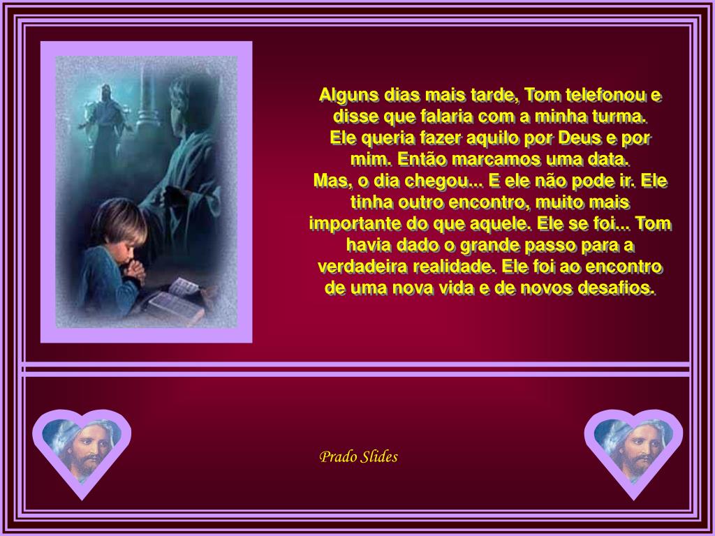 Alguns dias mais tarde, Tom telefonou e disse que falaria com a minha turma.Ele queria fazer aquilo por Deus e por mim. Então marcamos uma data.Mas, o dia chegou... E ele não pode ir. Ele tinha outro encontro, muito mais importante do que aquele. Ele se foi... Tom havia dado o grande passo para a verdadeira realidade. Ele foi ao encontro de uma nova vida e de novos desafios.