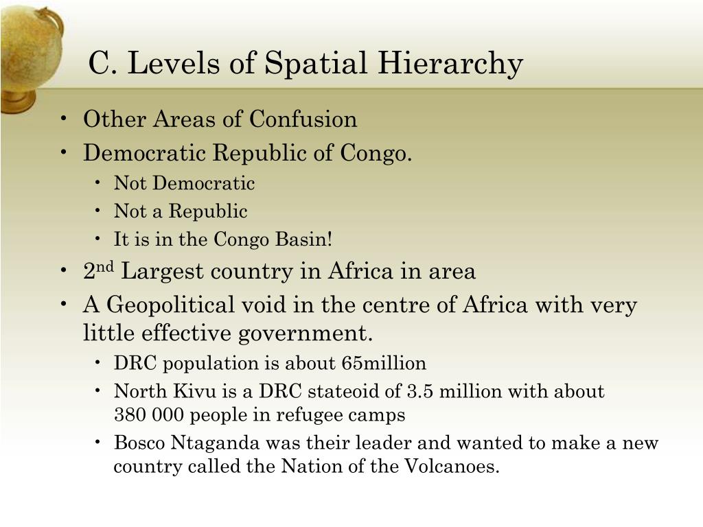 C. Levels of Spatial Hierarchy • Other Areas of Confusion • Democratic Republic of Congo. • Not Democratic • Not a Republic • It is in the Congo Basin! • 2nd Largest country in Africa in area • A Geopolitical void in the centre of Africa with very little effective government. • DRC population is about 65million • North Kivu is a DRC stateoid of 3.5 million with about 380 000 people in refugee camps • BoscoNtagandawas their leader and wanted to make a new country called the Nation of the Volcanoes.