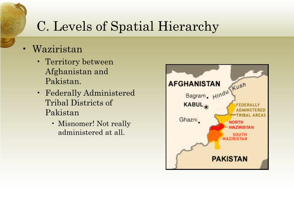 C. Levels of Spatial Hierarchy • Waziristan • Territory between Afghanistan and Pakistan. • Federally Administered Tribal Districts of Pakistan • Misnomer! Not really administered at all.