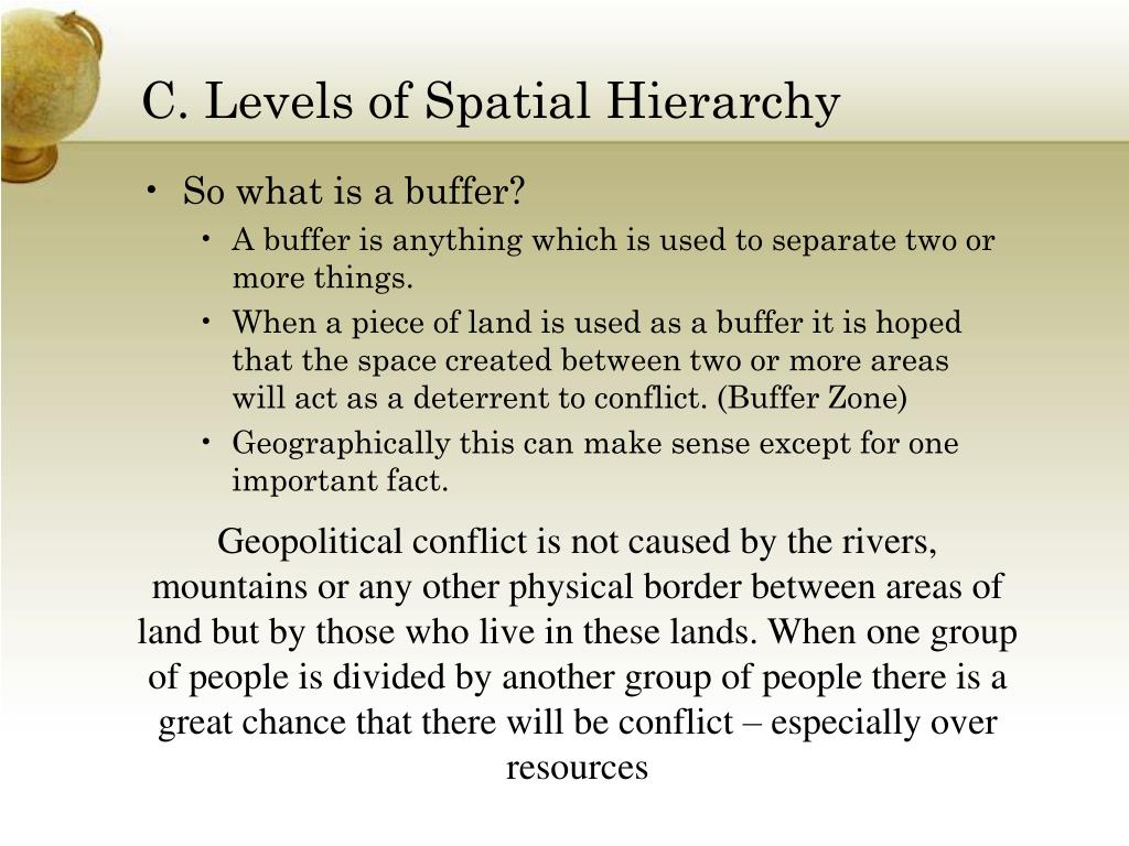 C. Levels of Spatial Hierarchy • So what is a buffer? • A buffer is anything which is used to separate two or more things. • When a piece of land is used as a buffer it is hoped that the space created between two or more areas will act as a deterrent to conflict. (Buffer Zone) • Geographically this can make sense except for one important fact. Geopolitical conflict is not caused by the rivers, mountains or any other physical border between areas of land but by those who live in these lands. When one group of people is divided by another group of people there is a great chance that there will be conflict – especially over resources