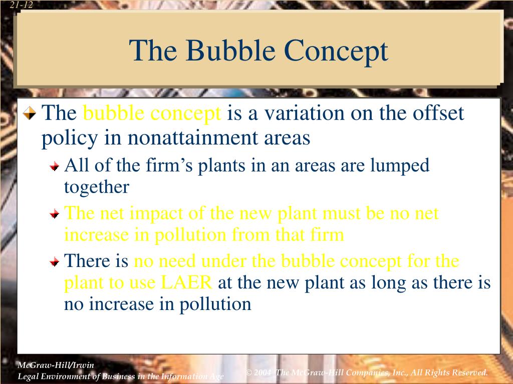 The Bubble Concept • The bubble concept is a variation on the offset policy in nonattainment areas • All of the firm’s plants in an areas are lumped together • The net impact of the new plant must be no net increase in pollution from that firm • There is no need under the bubble concept for the plant to use LAER at the new plant as long as there is no increase in pollution