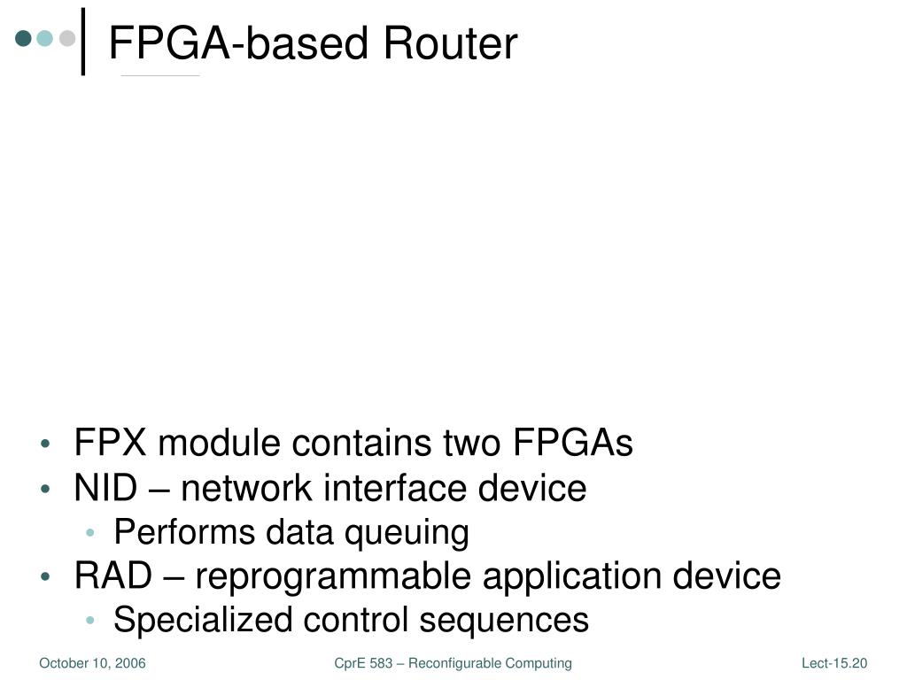 FPGA-based Router • FPX module contains two FPGAs • NID – network interface device • Performs data queuing • RAD – reprogrammable application device • Specialized control sequences CprE 583 – Reconfigurable Computing