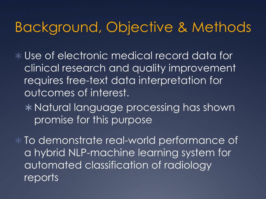 Background, Objective & Methods • Use of electronic medical record data for clinical research and quality improvement requires free-text data interpretation for outcomes of interest. • Natural language processing has shown promise for this purpose • To demonstrate real-world performance of a hybrid NLP-machine learning system for automated classification of radiology reports