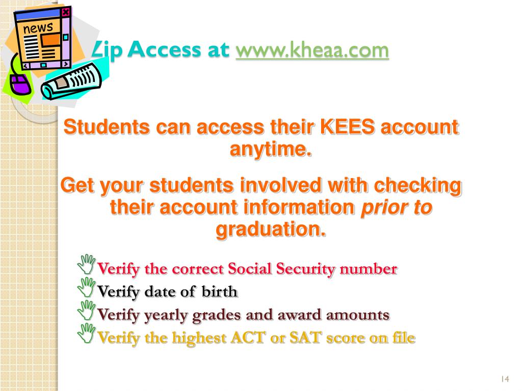 Zip Access at www.kheaa.com • Students can access their KEES account anytime. • Get your students involved with checking their account information prior to graduation. • Verify the correct Social Security number • Verify date of birth • Verify yearly grades and award amounts • Verify the highest ACT or SAT score on file