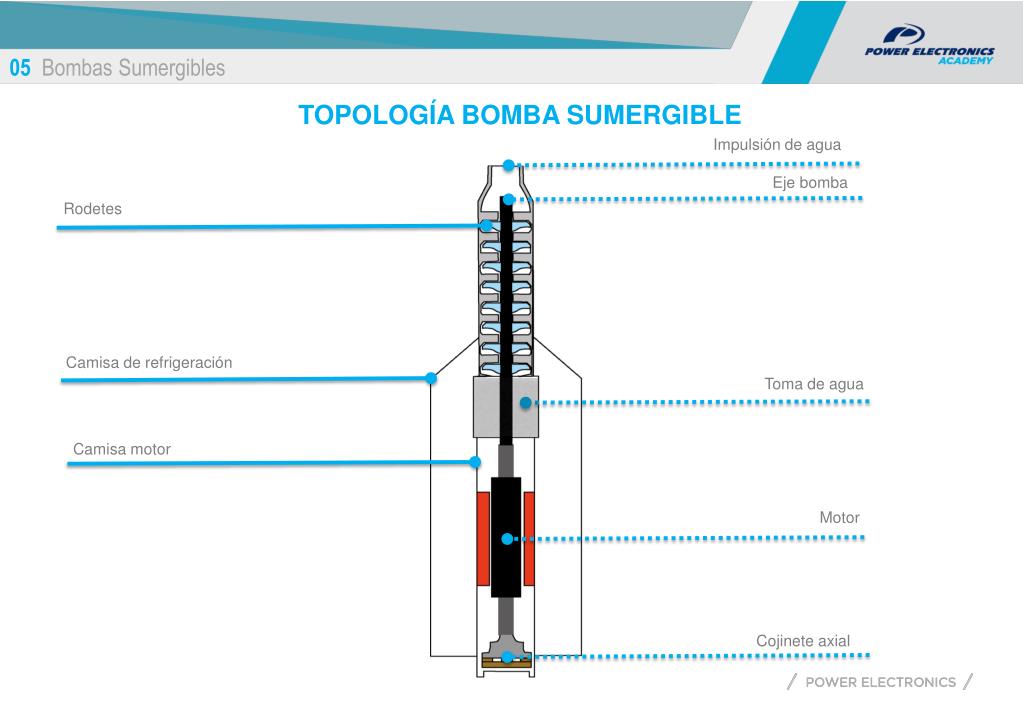 05 BombasSumergibles TOPOLOGÍA BOMBA SUMERGIBLE Toma de agua Eje bomba Camisa de refrigeración Impulsión de agua Motor Camisa motor Rodetes Cojinete axial