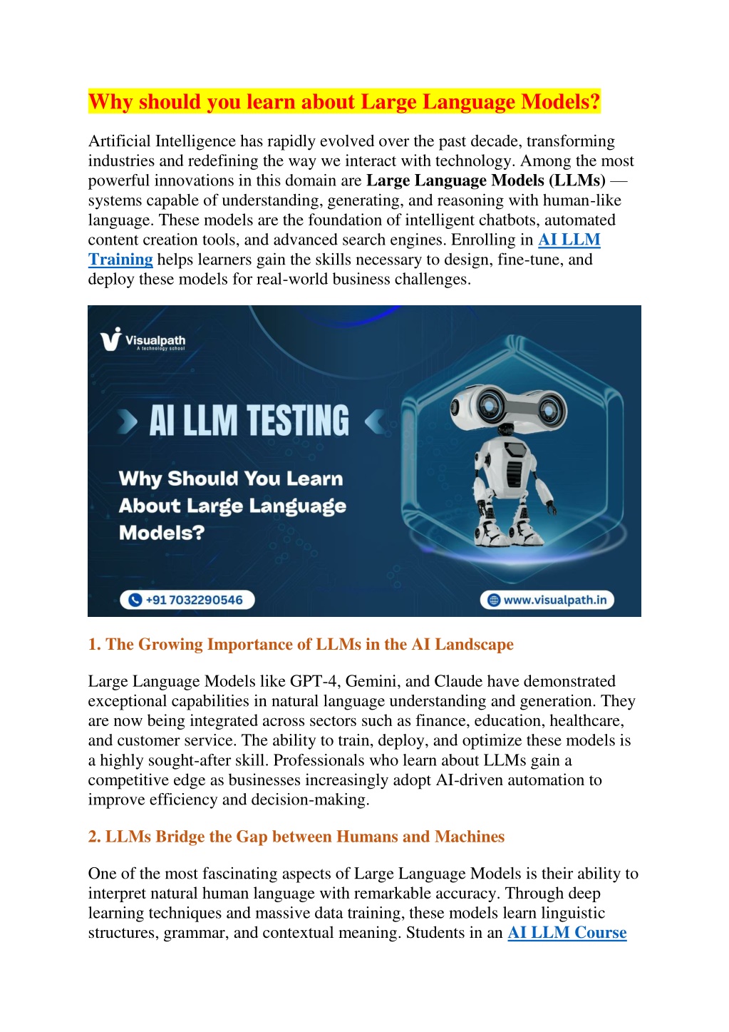 4. 3. How does an AI LLM Course boost your career? It opens high-demand AI roles like Prompt Engineer and NLP Developer. 4. What are real-world uses of LLMs? Used in chatbots, content creation, data analysis, and healthcare. 5. Why choose AI LLM Testing Training? It helps apply and evaluate LLMs practically with real-time projects. Conclusion: LLMs Are the Future of Intelligent Systems In a world driven by data and automation, understanding Large Language Models is no longer optional—it’s essential. They represent a bridge between human creativity and machine intelligence. Whether you’re a beginner or an experienced professional, investing in a structured AI LLM Course equips you with the expertise to create, deploy, and innovate using these transformative technologies. Visualpath stands out as the best online software training institute in Hyderabad. For More Information aboutthe AI LLM Testing Training Contact Call/WhatsApp: +91-7032290546 Visit: https://www.visualpath.in/ai-llm-course-online.html