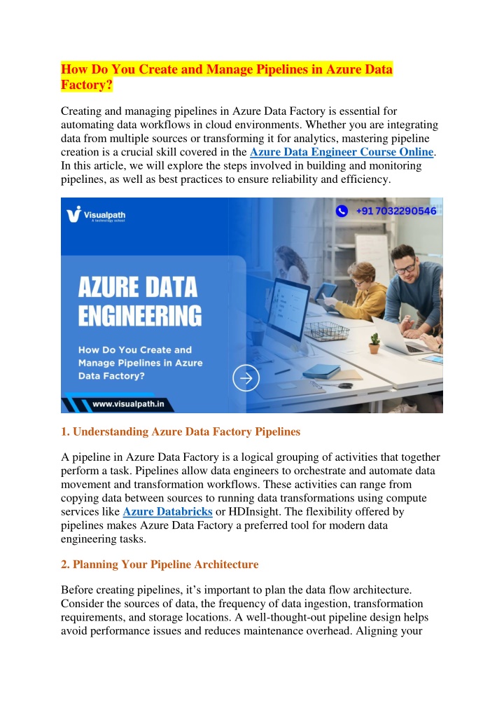 2. How do you schedule and monitor pipelines? Use triggers for scheduling and Monitor tab to track runs and errors. 3. How can you handle pipeline errors? Set retry policies and use error activities like try-catch for robustness. 4. What’s the use of parameterization in pipelines? It makes pipelines dynamic and reusable by avoiding hardcoded values. 5. Why is security important in pipelines? Use Azure Key Vault to securely store connection strings and credentials. Conclusion: Creating and managing pipelines in Azure Data Factory is a cornerstone of modern data engineering. By following structured steps, implementing robust error handling, and adhering to best practices, you can build pipelines that are scalable, secure, and efficient. Whether you're just getting started or advancing your expertise. Visualpath stands out as the best online software training institute in Hyderabad. For More Information aboutthe Azure Data Engineer Online Training Contact Call/WhatsApp: +91-7032290546 Visit: https://www.visualpath.in/online-azure-data-engineer-course.html