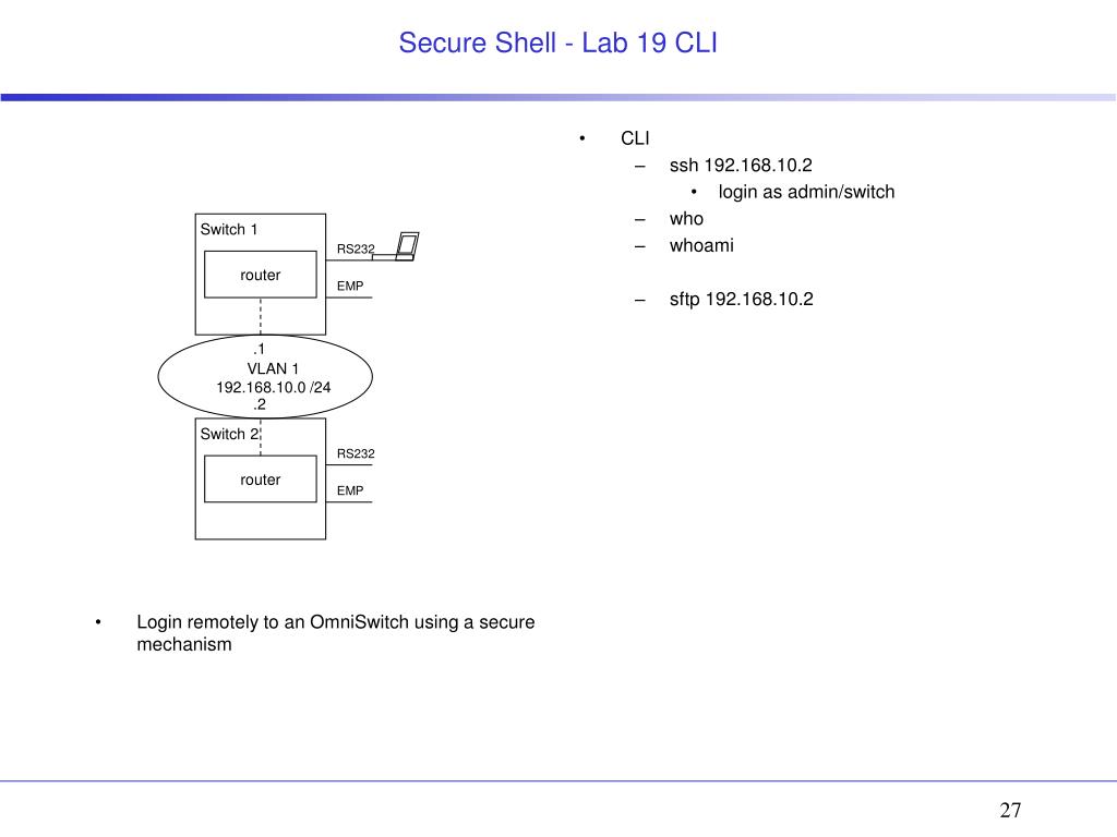 Login remotely to an OmniSwitch using a secure mechanism CLI ssh 192.168.10.2 login as admin/switch who whoami sftp 192.168.10.2 Secure Shell - Lab 19 CLI Switch 1 RS232 router EMP .1 VLAN 1 192.168.10.0 /24 .2 Switch 2 RS232 router EMP