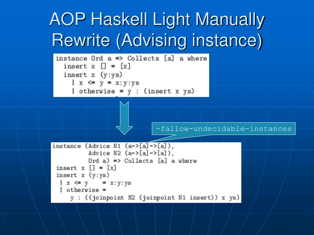 AOP Haskell Light Manually Rewrite (Advising advice body) -fallow-undecidable-instances