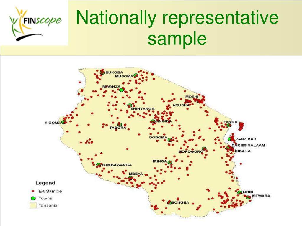 FinScope – scope of survey 2006survey: first nationally representative financial consumer perception survey Sample size 4,950 2009survey: regionally as well as nationally representative Sample size 7,680