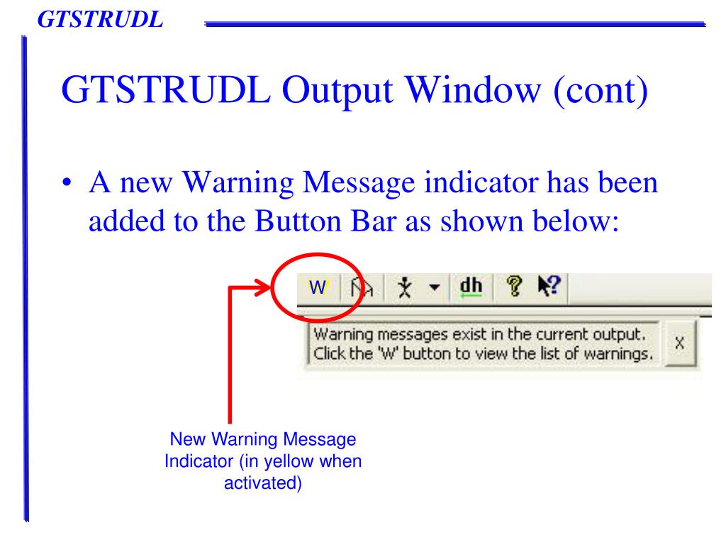 GTSTRUDL Output Window (cont) • A new Warning Message indicator has been added to the Button Bar as shown below: W New Warning Message Indicator (in yellow when activated)