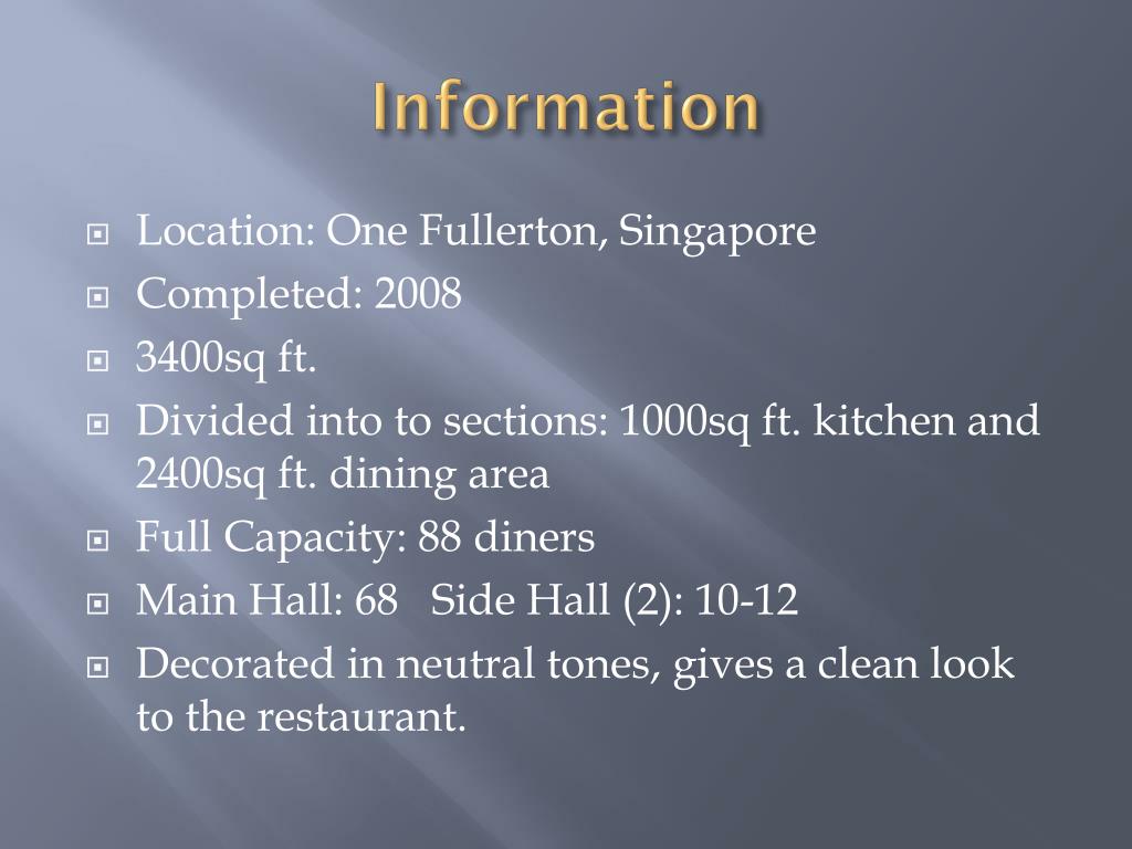 Information • Location: One Fullerton, Singapore • Completed: 2008 • 3400sq ft. • Divided into to sections: 1000sq ft. kitchen and 2400sq ft. dining area • Full Capacity: 88 diners • Main Hall: 68 Side Hall (2): 10-12 • Decorated in neutral tones, gives a clean look to the restaurant.